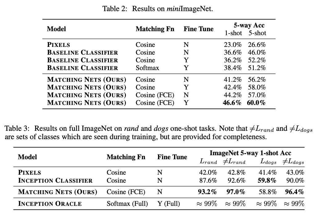 논문에서는 3종류의 데이터셋을 사용하여 matching network를 실험하였다. 자세한 설정은 논문을 참고하길 바라고 여기서는 간단히 실험 결과에 대해서만 리뷰하겠다.